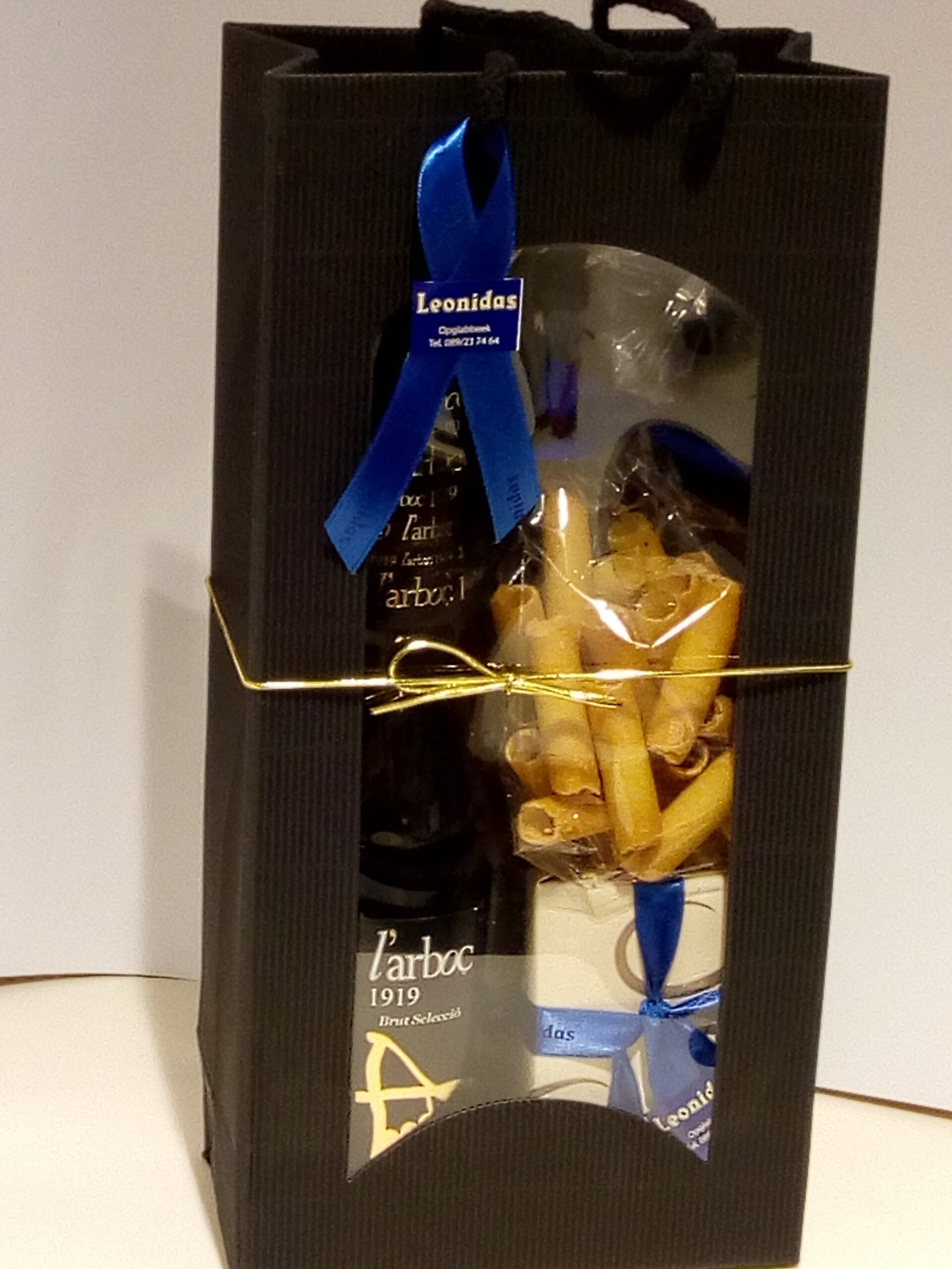 Pakket met koekjes, doosje van 250 gr pralines en een lekkere fles Cava