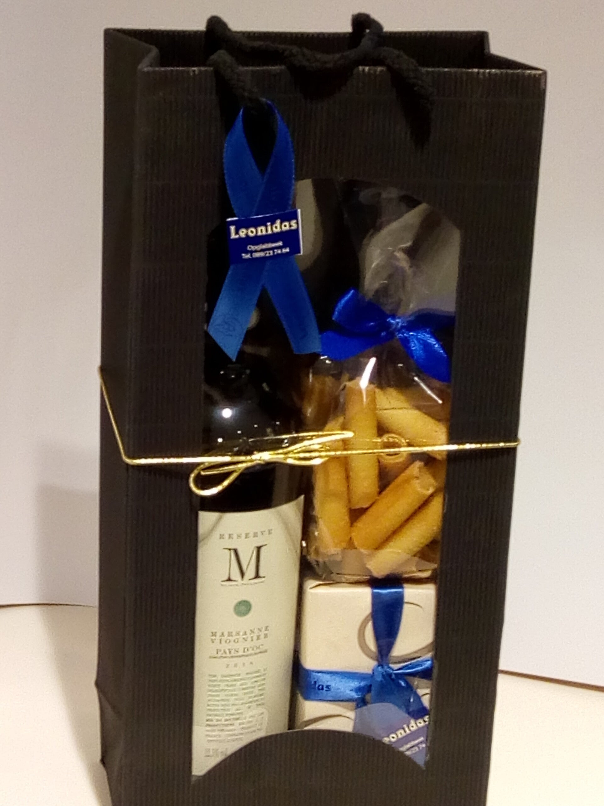 Pakket met koekjes, doosje van 250 gr pralines en een lekkere fles witte wijn